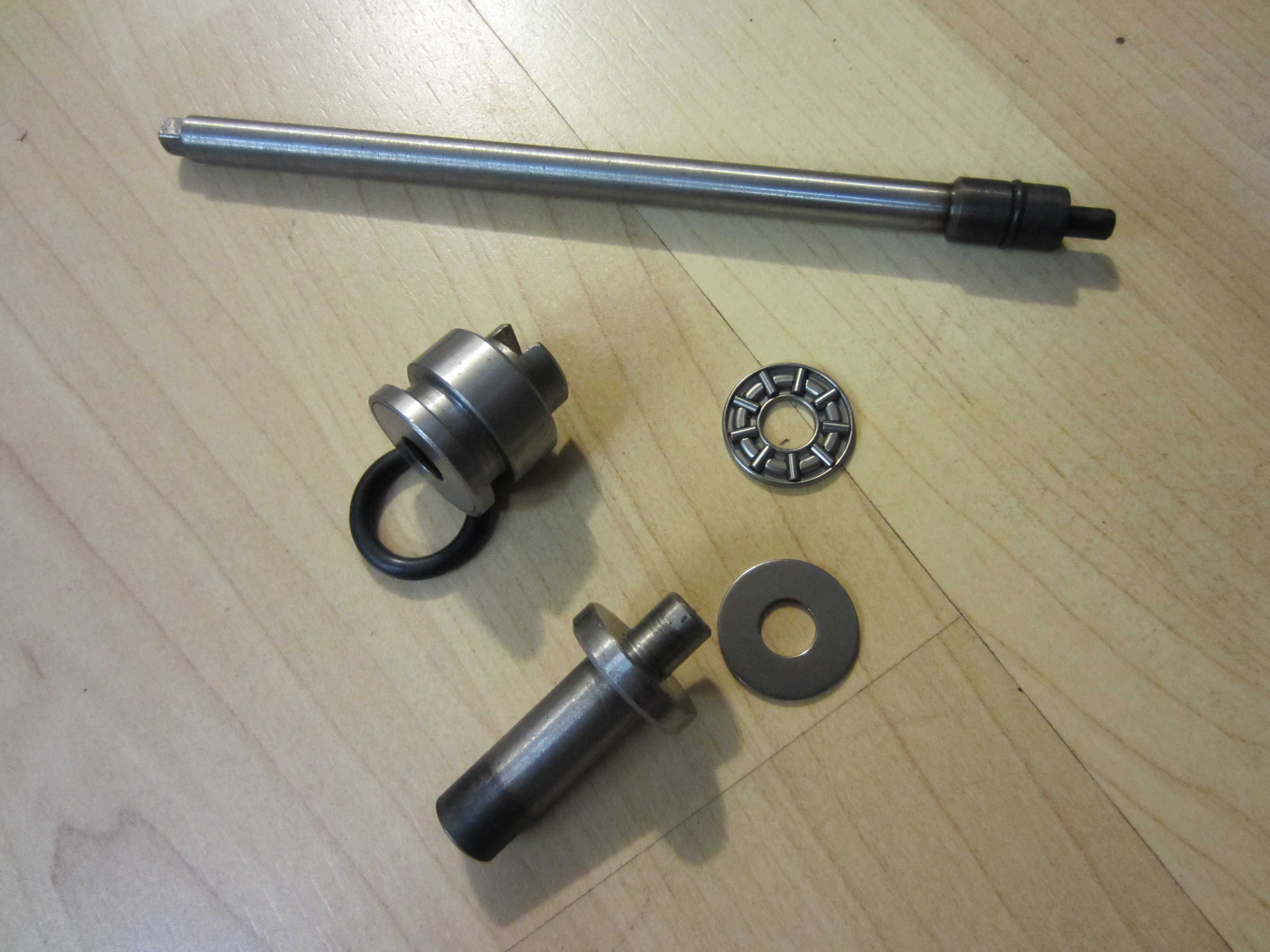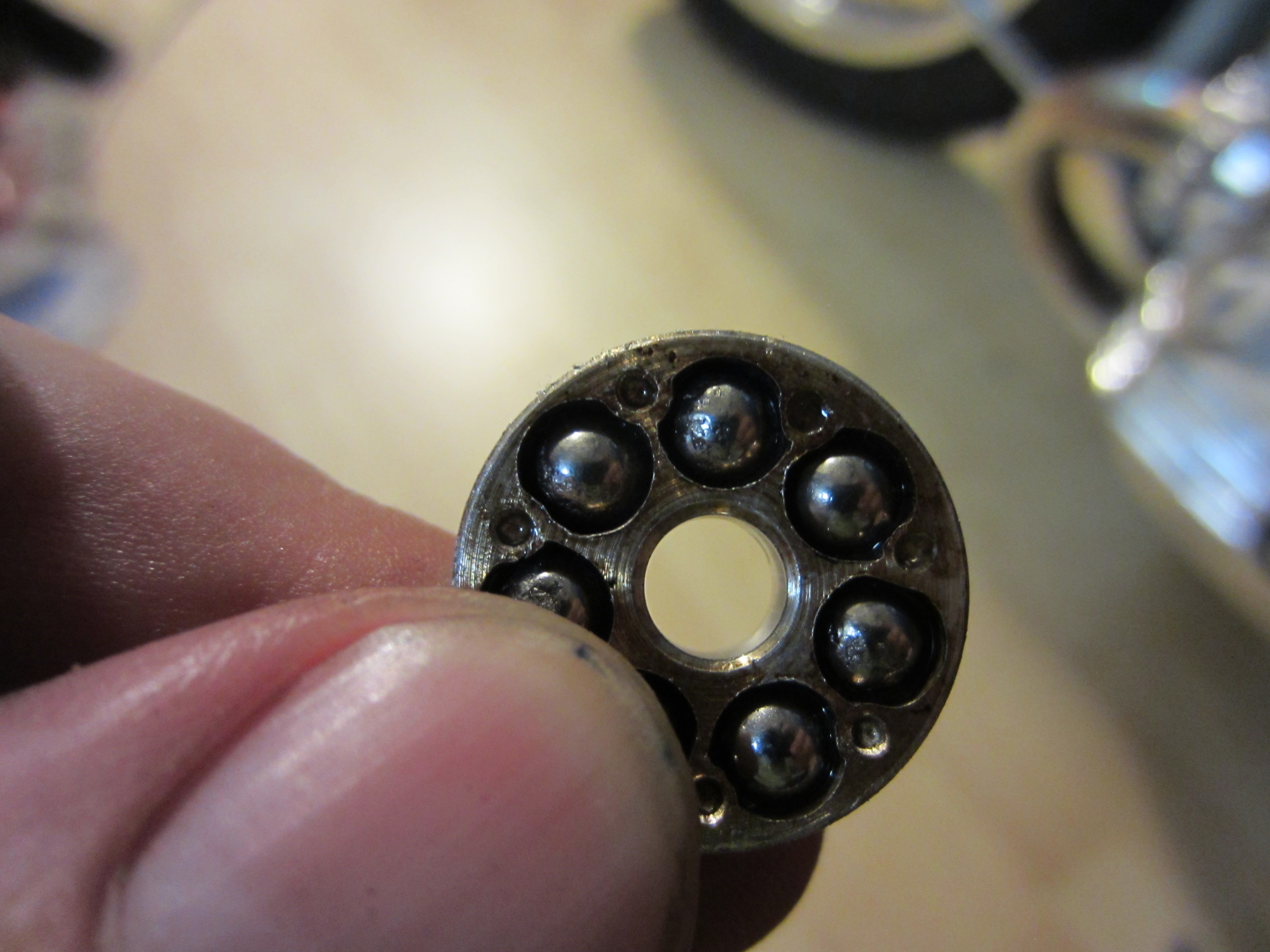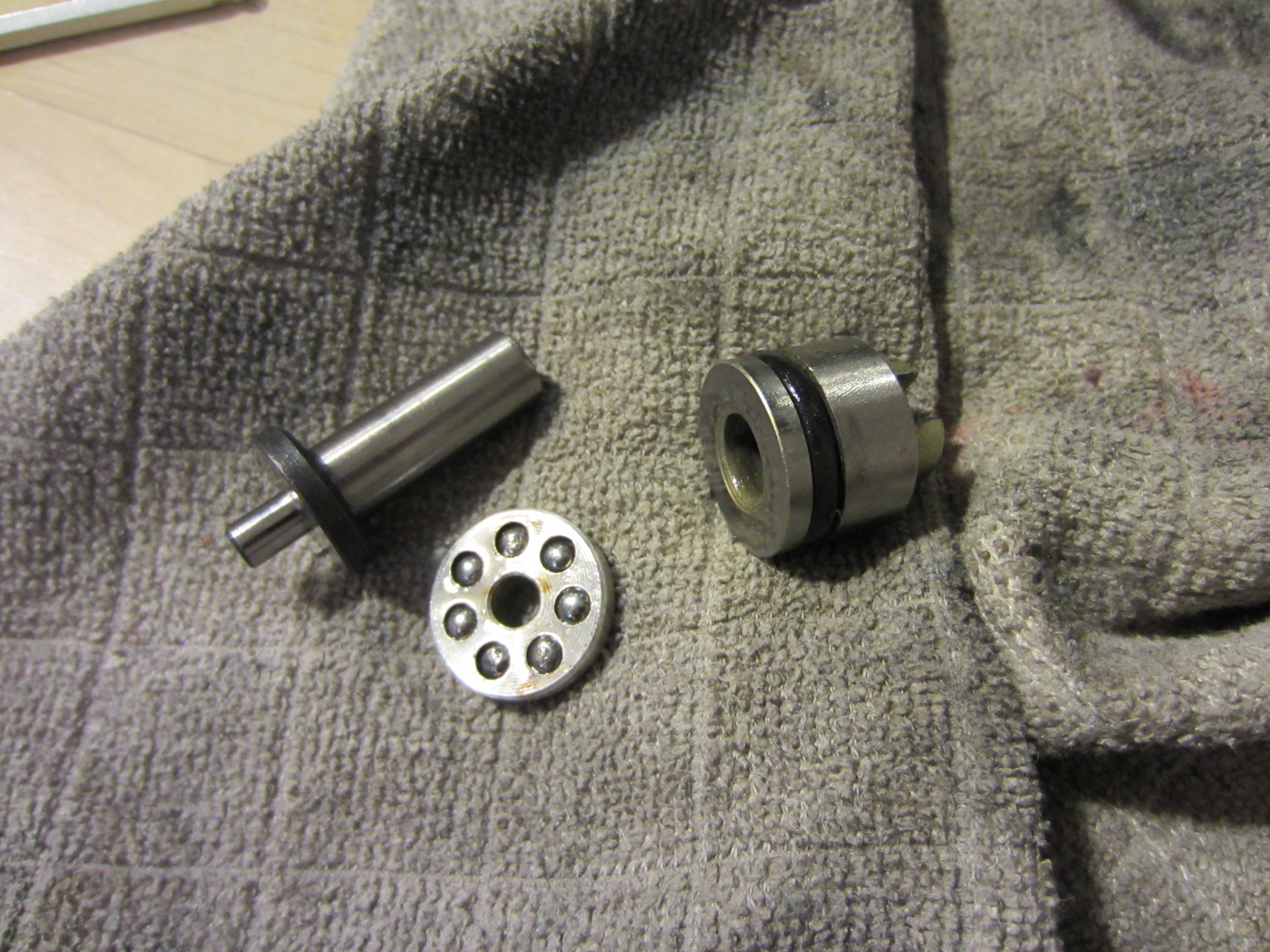 Then the assembly is the reverse of the disassembly, first the longer race piece goes in, then the flat washer, then the roller bearing and finally the outer race w/ o-ring.