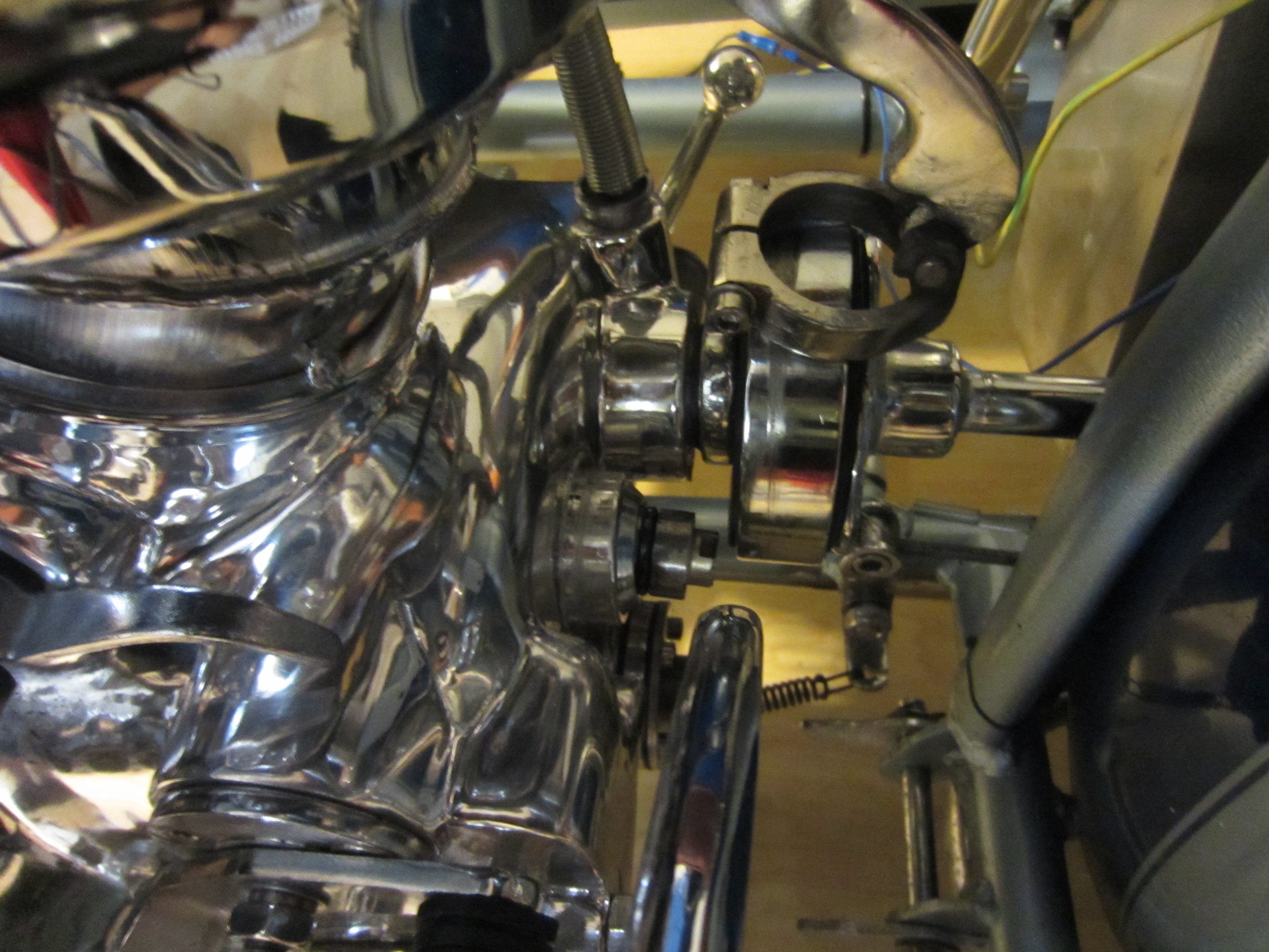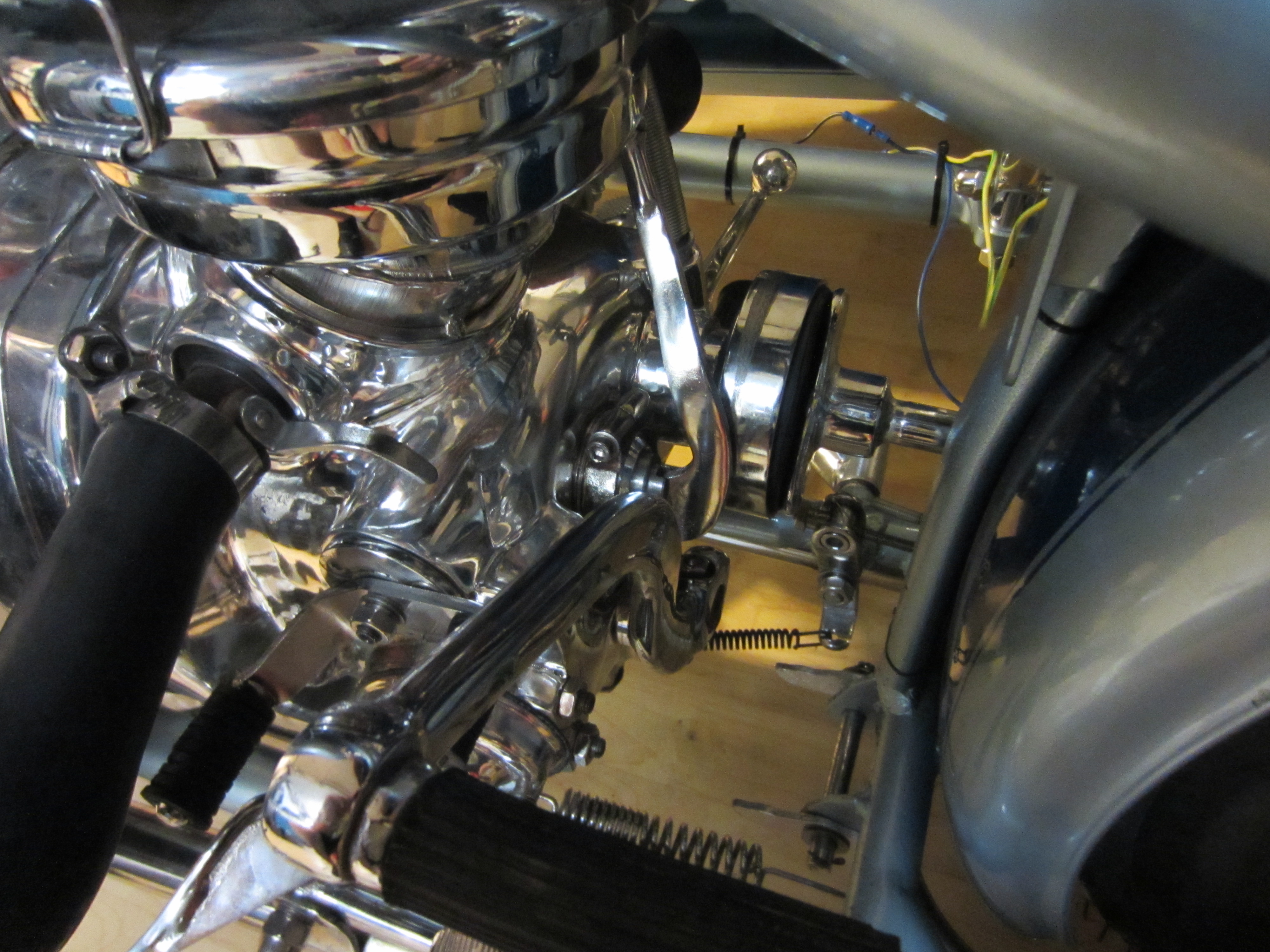 On the sidecar, the left handle bar lever pulls a cable that goes down to the back of the transmission, where it pushes on a round button on the transmission.