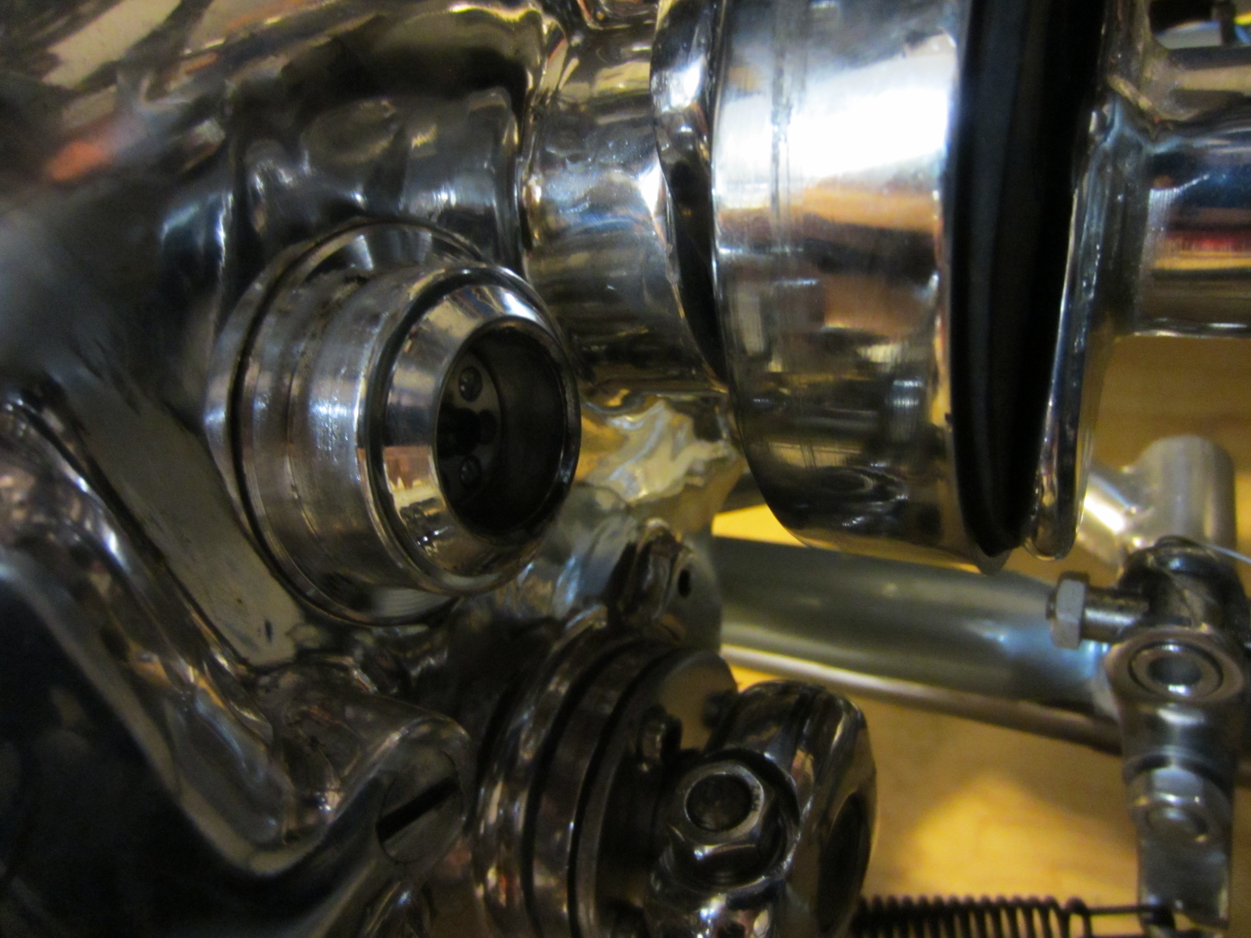 The lever is fastened to a pivot that is part of a ring that clamps around this area. Loosening one bolt and the lever and pivot ring slide right off. From there, the button can be pulled out, as it is is sealed by an O-ring (this is one hard face of the bearing race), and that exposes the clutch throw-out bearing.